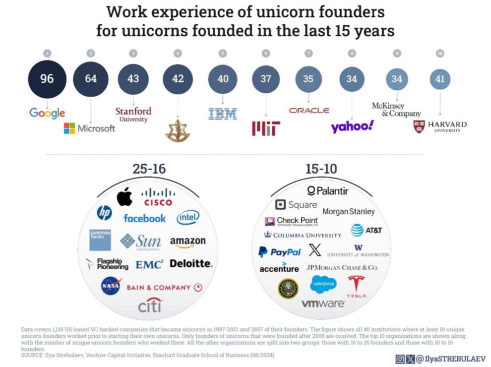 За последние 15 лет, основатели единорогов (компания с капитализацией больше 1 млрд $) работали в более чем в 6 000 разных компаниях. Однако, суперуспешные стартапы были запущены основателями, которые работали в одной из 33 компаний.