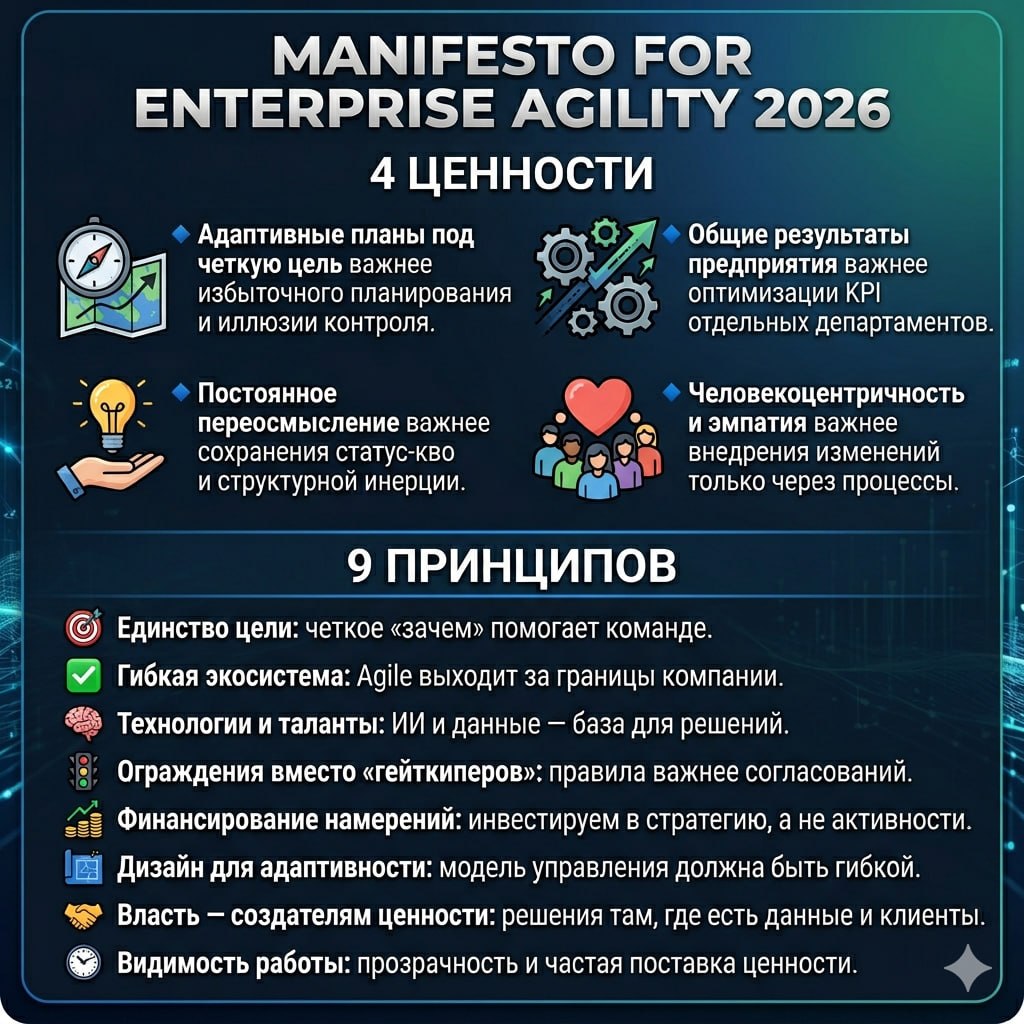 В 2025 году PMI объединился с Agile Alliance, и возник соблазн переписать классику. Так появился Manifesto for Enterprise Agility. Страниц стало больше — 11 стр., а фокус сместился с команд на всю корпоративную систему.